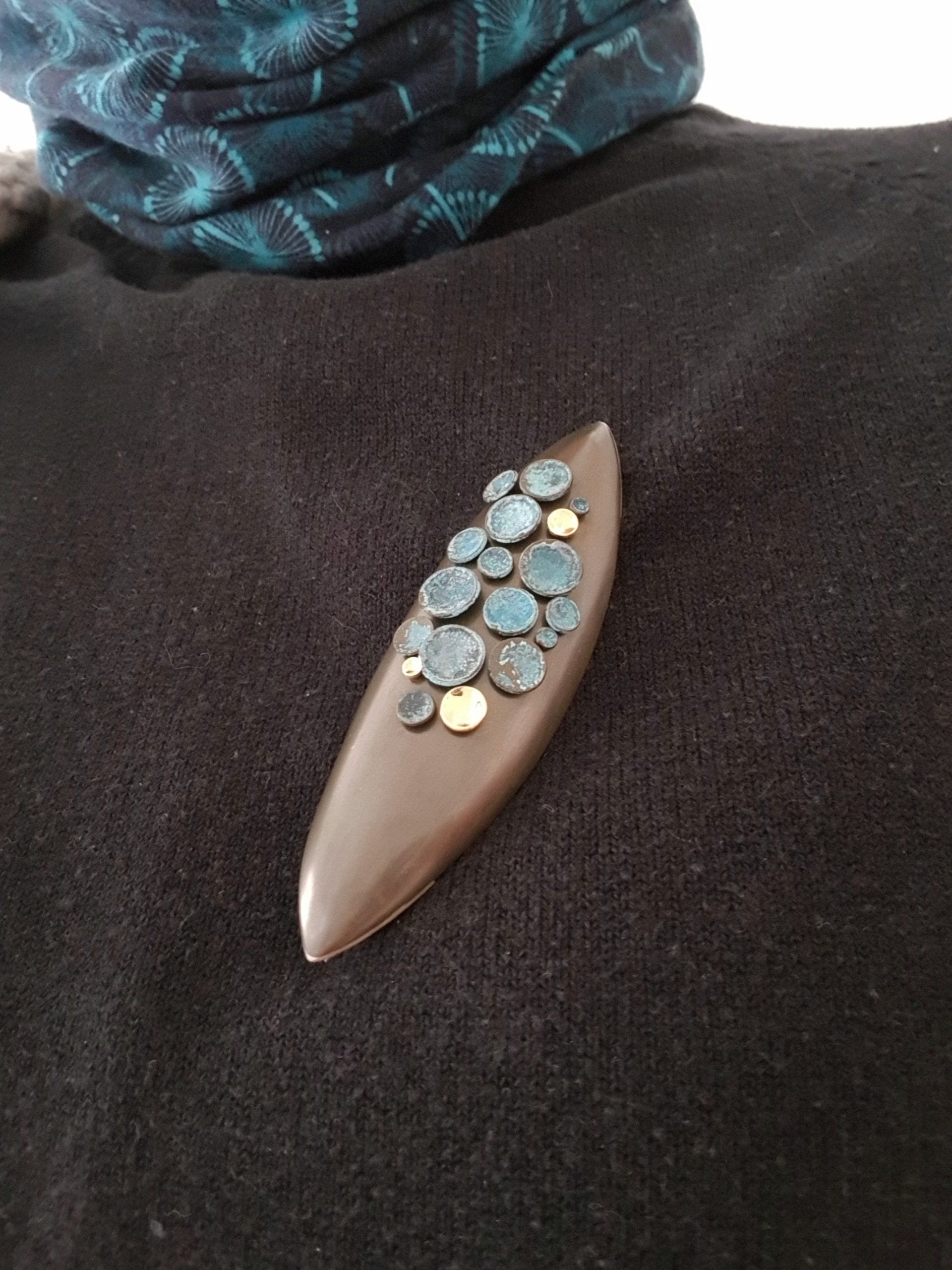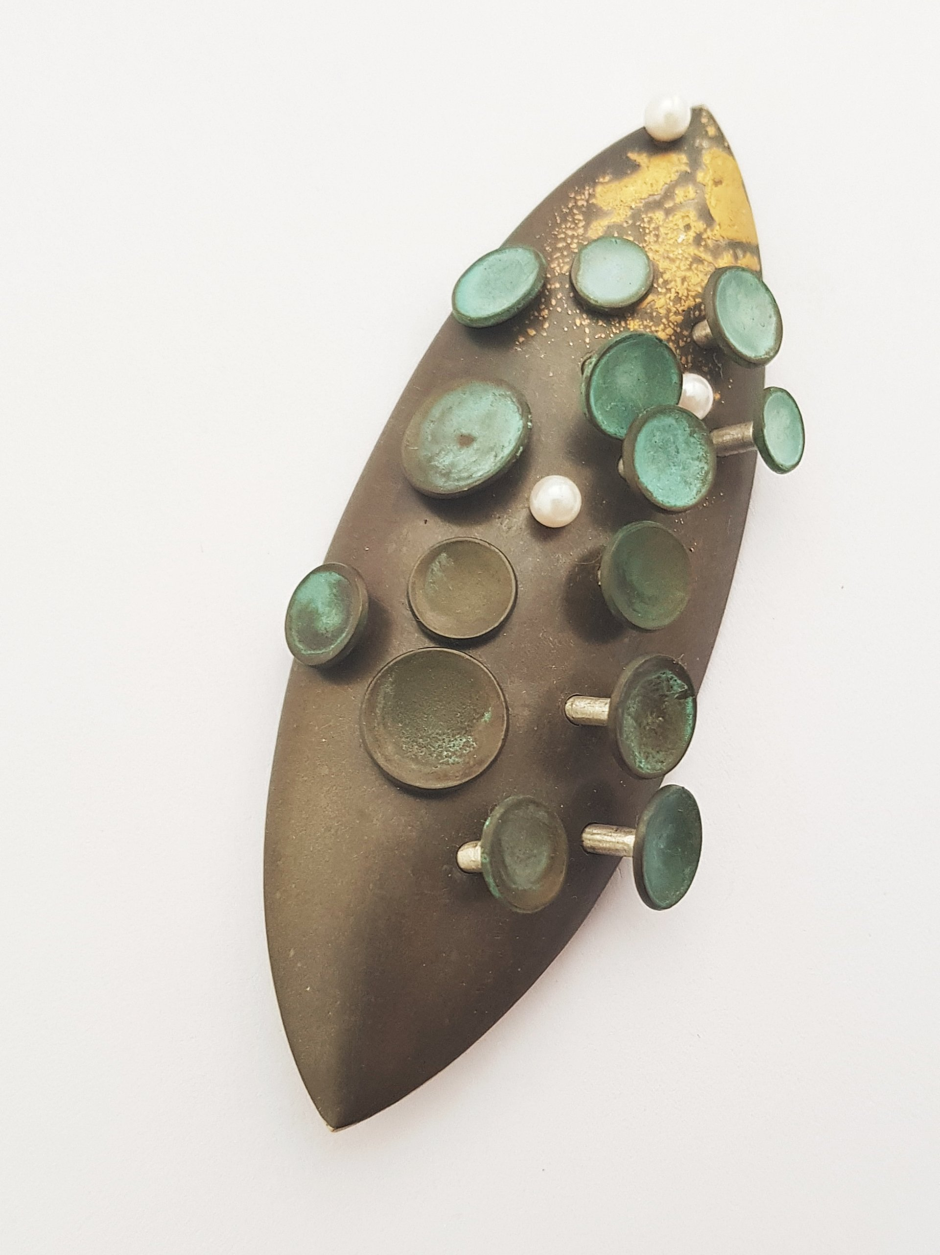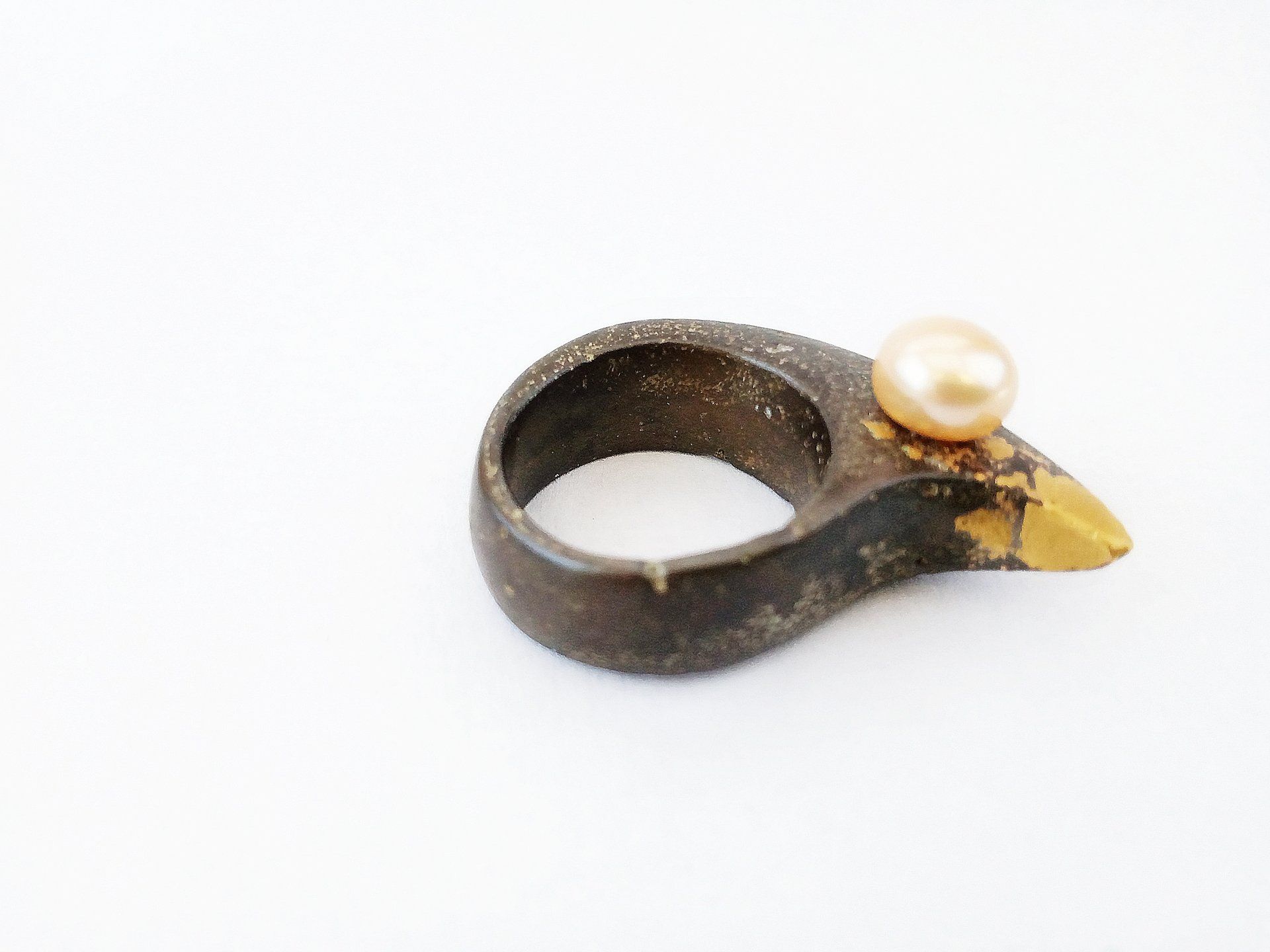 Shibuichi, 24ct Gold, cultured Pearl, Japanese patina