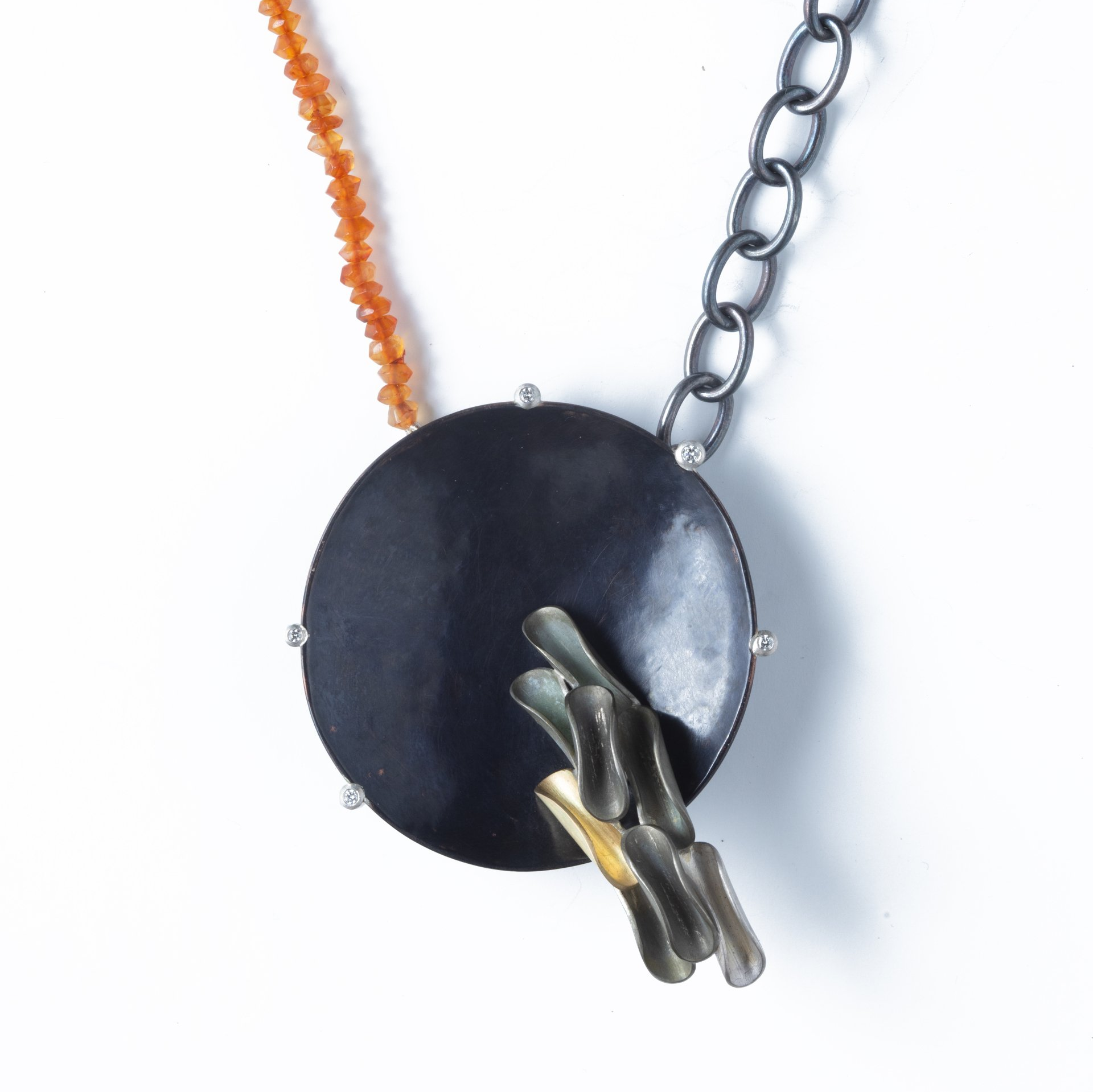 Shakudo, Shibuichi, Fine Silver, Fine Gold, Sterling Silver, bead of Carneol, white Diamonds, Japanese patina